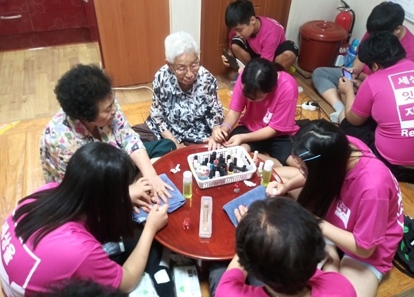 무주중학교 1학년 학생들이 6일과 7일 이틀에 걸쳐 읍내 노인정(남천,운교,죽산,사정)들을 순회하면서 네일아트와 즉석사진 촬영·인화 후 전시, 어르신들의 안부를 묻는 안녕 리액션 등 다양한 봉사활동을 펼치면서 어르신들과의 교감을 가졌다.
