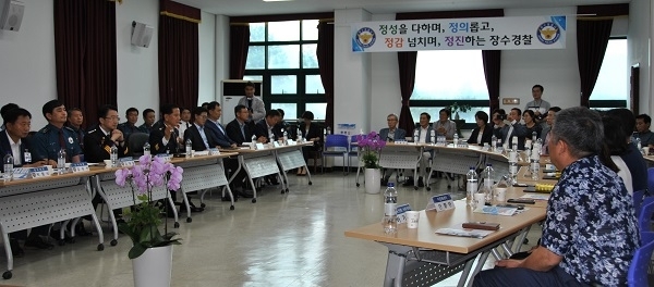 조용식 전북지방경찰청장이 8일 장수경찰서(서장 박정원)를 초도 방문해 민생 현장의 다양한 의견을 청취했다. 조 청장은 첫 일정으로 협력단체장과 지역별 주민 등 50여명이 참석한 가운데 가진 치안설명회에서‘정성·정의·정감·정진’ 4대 핵심가치를 주요 치안정책으로 삼고 언제나 주민과 함께하는 따뜻하고 믿음직한 경찰상 구현을 적극적으로 추진해 신뢰받는 경찰상을 정립해 나가겠다고 밝혔다.