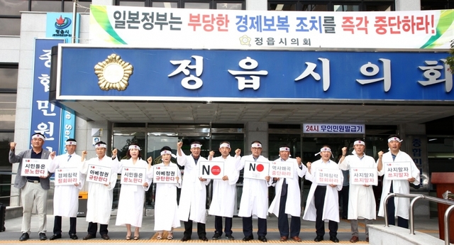 정읍시의회(의장 최낙삼)는 지난9일 의회 청사 앞에서 ‘일본의 경제침략 행위 규탄 결의대회’를 가졌다.