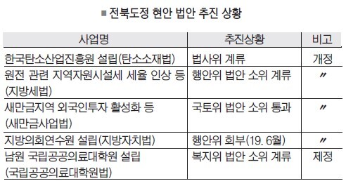 이와 함께 새만금지역 외국인 투자 활성화(새만금사업법), 지방의회연수원 설립(지방자치법) 등 지역 현안을 풀 열쇠가 될 관련 법안 처리에 속도를 내야 한다는 지적이 나온다.