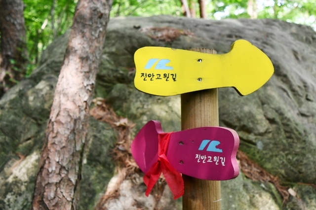 진안고원길은 인상적인 표지판이 안내합니다. 홍삼색과 인삼색으로 구성된 표지판은 진안 특산물, 홍삼과 인삼을 나타냅니다.