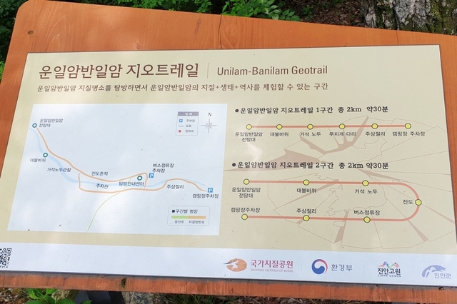 진안고원길 9코스 운일암반일암 숲길은 삼거에서 주천면사무소까지 8.8km에 이르는 길입니다. 3시간이 소요되고요. 난이도는 어린 유아들도 걸을 수 있습니다. 운일암반일암을 보면서 걸을 수 있는 나무 데크가 잘 조성되어 있거든요. 숲길을 따라 걷는 짧은 구간으로 전망대와 무지개다리에서 운일암반일암과 천변의 아름다운 풍경을 볼 수 있습니다.