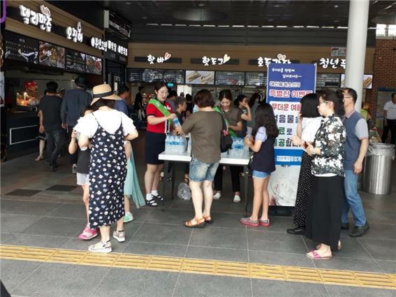 익산 여산(순천)휴게소가 여름 휴가철을 맞아 휴게소를 방문한 고객들에게 얼음물을 제공하는 등 안전한 휴가길 캠페인을 실시했다.