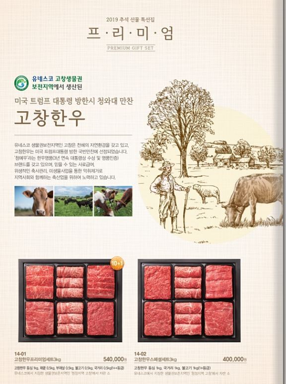 13일 고창군에 따르면 9700여 개의 세븐일레븐 자사 편의점과 인터넷, SNS유통망에 배포될 공식 카탈로그 첫 장에 고창한우가 소개된다. 여기에 ‘유네스코고창생물권보전지역’ 상징마크는 물론, ‘미국 트럼프 대통령 방한시 청와대 만찬’에 올랐다는 내용까지 포함된다.