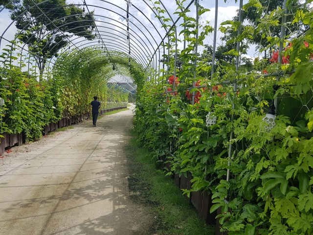 조성된 생태 그늘터널에는 줄무늬국수호박 등 알록달록 관상용 호박과 조롱박, 백향과, 작두콩 등 13종의 덩굴식물을 심었고, 터널에 LED 등을 달아 야간에 생태공원을 방문하는 군민에게 새로운 볼거리를 제공하고 있다.