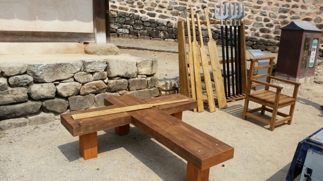 진행방법 : 준비된 형구와 널뛰기를 옥과 동헌 앞에 설치합니다.