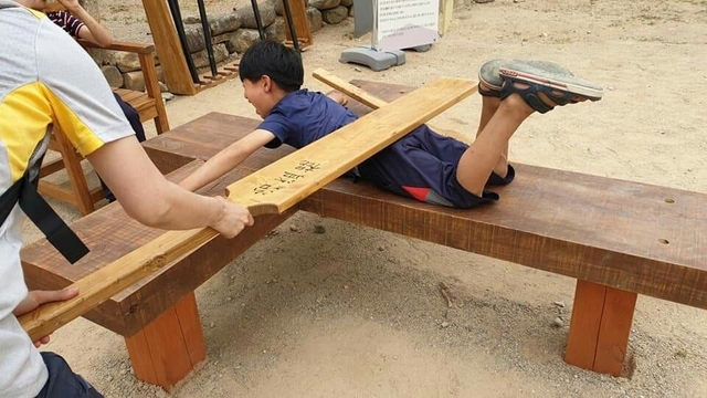 관광객들은 누구나 준비된 형구나 널뛰기에 참여하여 즐길 수 있습니다.