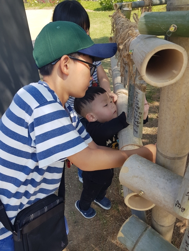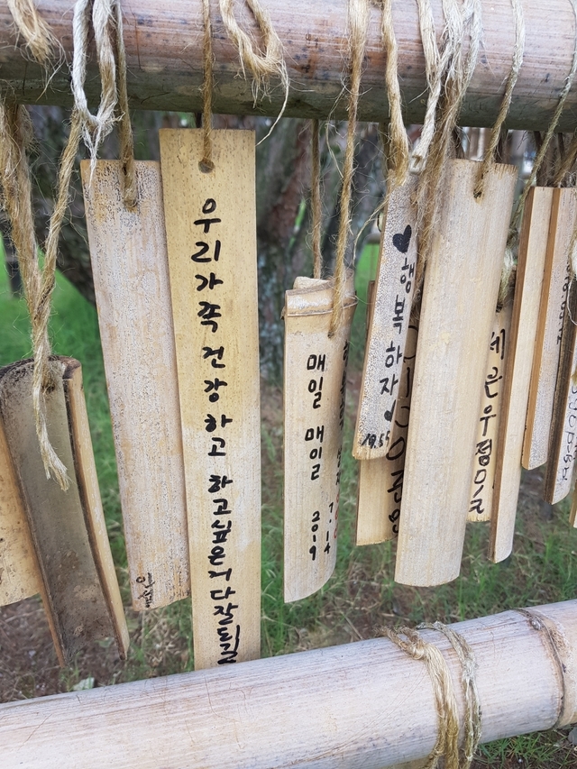 아직 글씨를 쓰지 못하는 막내는 펜으로 열심히 끄적이고 두 아이는 간절한 소원을 적어 나무에 걸었습니다. 거창한 소원은 아니지만, 소원 대나무패를 적고 거는 것만으로도 소원이 이루어진 기분이 들었습니다. 저마다 대나무 패에 쓰인 소원성취 글이 소박하면서도 누군가를 위해 기원하는 문구 하나하나 정성스럽게 쓰여 있는 소원이 꼭 이루어졌으면 하는 바람입니다.