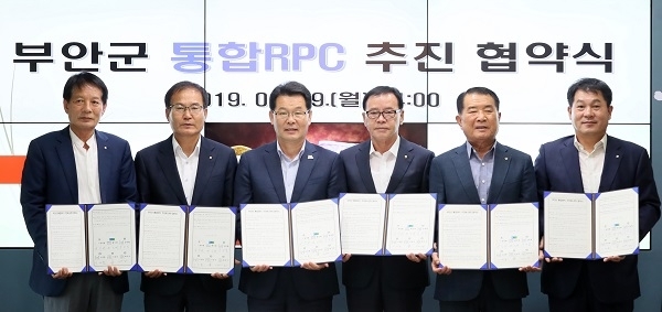 부안군과 농협중앙회 부안군지부 및 4개 농협(부안농협, 부안중앙농협, 계화농협, 남부안농협)은 지난 19일 미래농업의 부안쌀 경쟁력 강화를 위한 통합RPC 협약식을 체결했다.