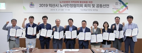 익산시는 27일 익산예술의전당에서 노사민정협의회를 개최하고 익산의 지속가능한 성장과 노사상생의 좋은 일자리 창출을 결의하는 ‘익산시 노사민정 공동선언문’을 채택했다.