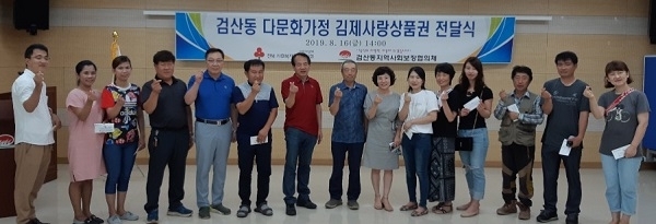 김제시 검산동 지역사회보장협의체(위원장 한남수)는 검산동에 거주하는 다문화 10가정에게 김제사랑상품권을 전달하는 시간을 가졌다.