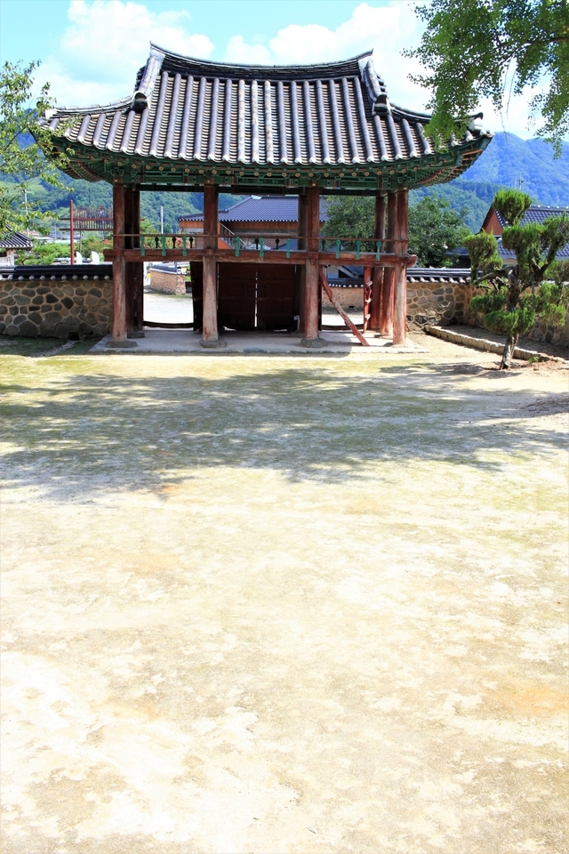 강당에 앉아 현가루 방향을 바라보면 마당에 황토가 군데군데 뿌려져 있는 것을 볼 수 있습니다.