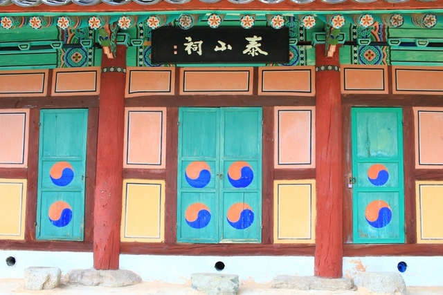 강당에서 뒤쪽을 보면 마루 건너로 태극문양이 눈에 들어옵니다. 내삼문(內三門)으로 공부하는 공간과 제사를 모시는 공간의 경계를 표시합니다. 삼문을 들어가면 사우(祠宇)인 태산사(泰山祠)입니다. 신라 말 이곳 지명이 태산(泰山)이었는데요. 고운 최치원이 태산 태수로 부임해서 8년 동안 선정을 베풀고 떠나자 주민들이 생사당(生祠堂, 살아있는 사람을 기리기 위해 세운 사당)을 세우고 태산사(泰山祠)라고 한 데서 유래되었습니다. 이곳에는 최치원, 신잠, 정극인, 송세림, 정언충, 김약묵, 김관 7인을 배향하고 있습니다.