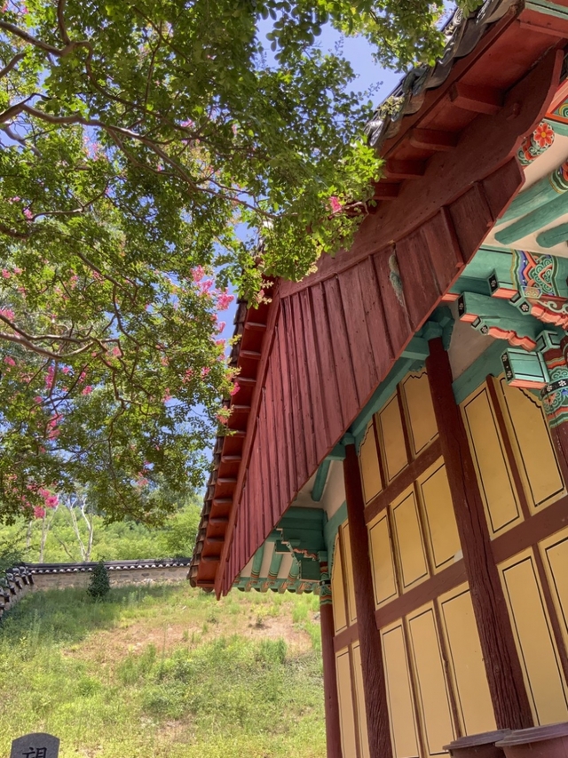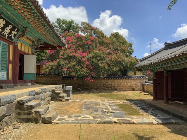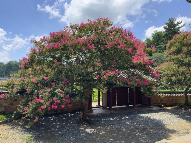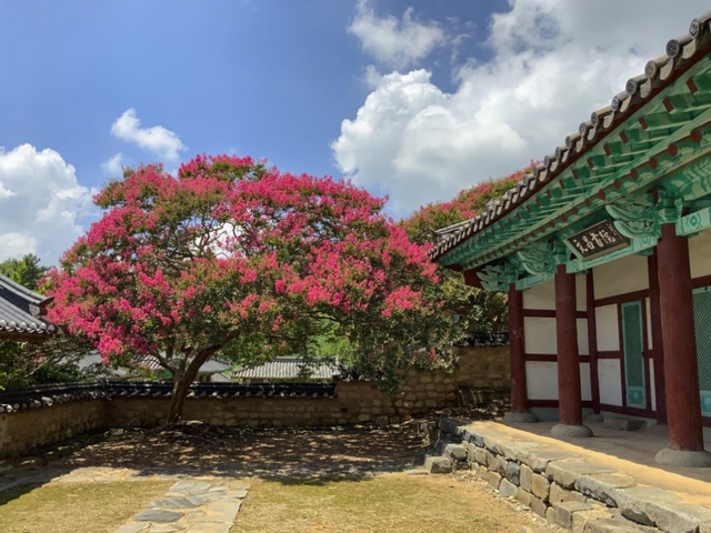 배롱나무꽃은 7월에서 9월까지 약 100일 사이에 꽃을 피운다고 하여 백일홍이라고도 불립니다. 햇살이 뜨거운 한여름에 꽃이 피기 때문에 손수건과 얼음물은 필수죠. 이렇게 더운 날에도 옥구 향교를 찾는 건 그만큼 이곳의 꽃이 볼만한 가치가 있기 때문입니다.