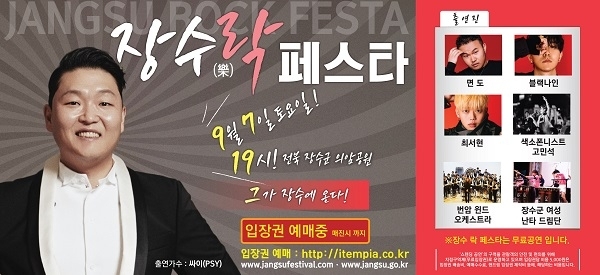 특히 7일 축제 2일차에 진행되는 장수 락(樂) 페스타는 저녁 7시 장수군 의암공원 한누리 종합운동장 메인무대에서 장수 레드의 열정을 닮은 가수 싸이(PSY)가 출연해 장수의 밤을 뜨겁게 달군다.