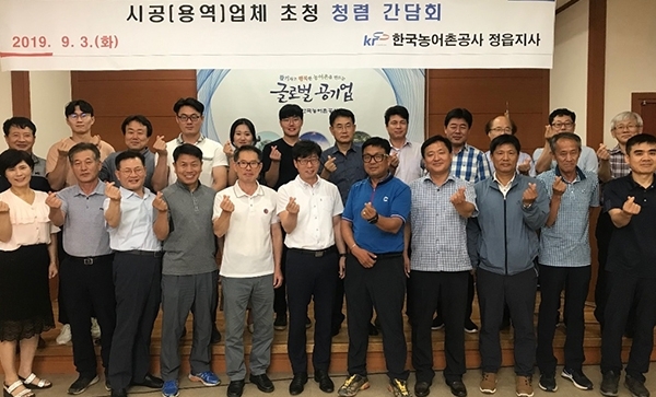 한국농어촌공사 정읍지사(지사장 김경진)는 지난3일 공사(용역)업체 관련자 15명및 공사감독 업무 담당 직원들을 대상으로 ‘청렴 간담회’를 마련해 반부패 청렴문화 정착을 결의했다.