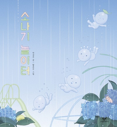 “먹구름이 몰려와 고요해진 놀이터에 후드득, 소나기가 내리기 시작해요. 소나기 빗방울들은 그네를 흔들흔들, 미끄럼틀에서 쭈욱, 철봉에 대롱대롱. 빗방울들과 함께 놀아요, 소나기 놀이터에서!”