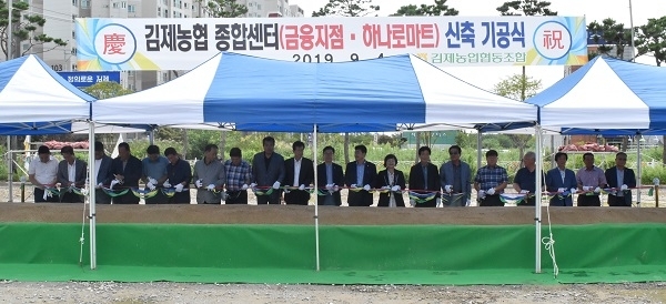 김제농협이 최근 이정용 조합장을 비롯해 농협중앙회 최기현 김제시지부장 및 임직원 등이 참석한 가운데 종합센터(금융지점 및 하나로마트) 신축 기공식을 갖고 첫 삽을 떴다.