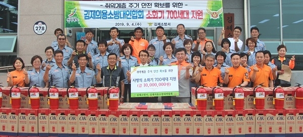기증된 소화기는 김제시 관계부서와 협의를 통해 취약계층 등 700세대를 선정 보급·설치할 계획이다.