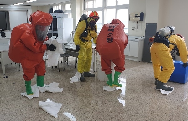 이날 새로 구입한 포름알데히드 16리터(2리터 8개)를 과학실 내 보관함으로 옮기는 과정에서 약 5리터가 바닥으로 누출된 것으로 알려졌다.