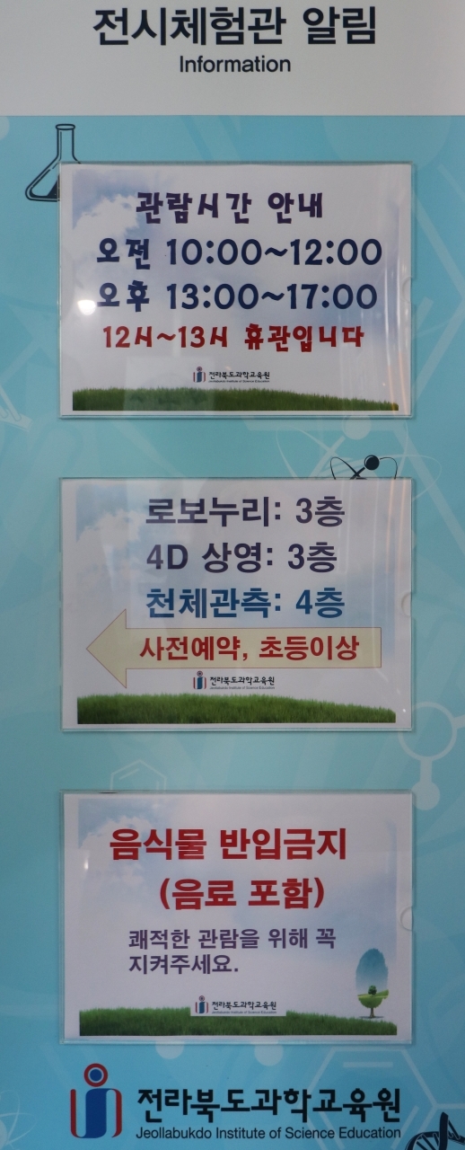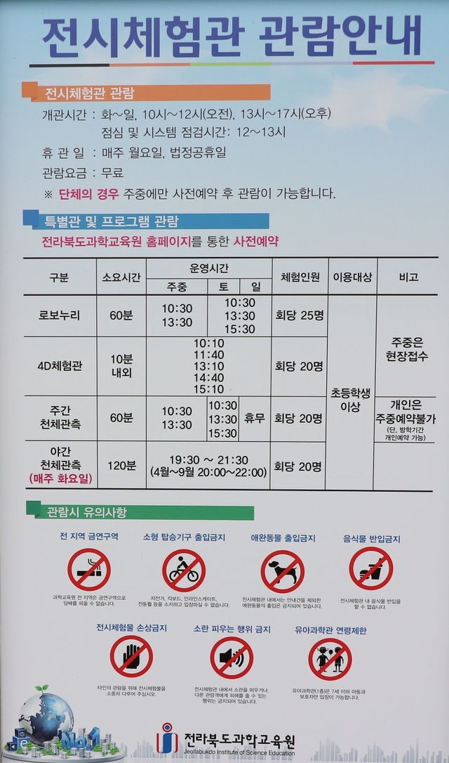 전시체험관은 화~일요일 사이에 관람할 수 있으며 12시부터 13시까지는 점심시간 및 시스템 점검시간으로 관람이 불가합니다. 로보누리, 4D체험관, 주간 천체관측, 야간 천체관측과 같은 특별관 및 프로그램은 전라북도과학교육원 홈페이지를 통한 사전예약 후 이용할 수 있으며 초등학생 이상 체험이 가능합니다.