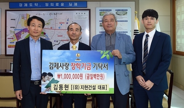 (유)지현건설 김동현 대표가 16일 김제사랑장학재단(이사장 박준배)에 인재 양성을 위해 써 달라며 장학금 100만원을 기탁했다.