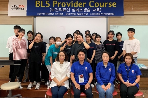 전주비전대학교(총장 홍순직)가 치위생과·응급구조과 융복합 과정으로 3학년 43명을 대상으로 응급상황에서 신속하고 능동적으로 대처해 환자의 생명을 구하는 보건의료인 심폐소생술(Basic Life Support Provider Course) 교육을 이수했다고 16일 밝혔다.