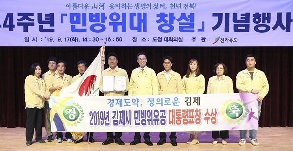 김제시가 지난 17일 전북도청에서 열린 ‘제44주년 민방위대 창설 기념식’에서 민방위 장비 현대화, 대피·급수·경보시설 확대 기여로 대통령 기관 표창 및 행정안전부 장관 민간인. 공무원 표창을 동시 수상하는 영광을 않았다.