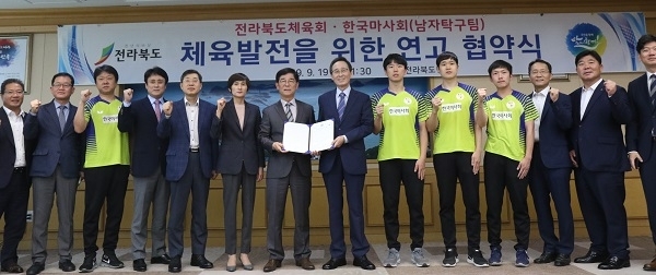 19일 전라북도체육회(회장 송하진)에 따르면 ‘한국마사회 남자탁구팀 전북 연고 협약식(MOU)’이 이날 도청 접견실에서 열렸다.