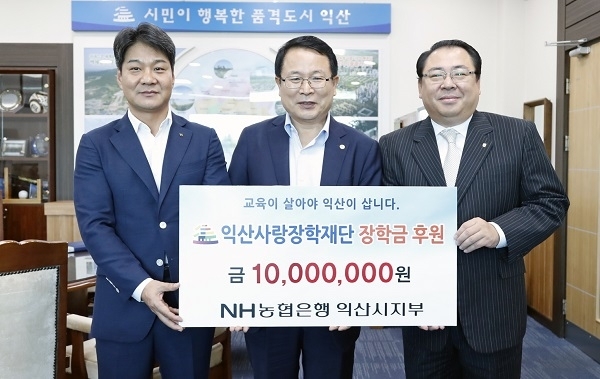 NH농협은행 익산시지부(지부장 이종찬)는 23일 (재)익산사랑장학재단을 방문해 지역인재육성을 위한 장학기금 1000만 원을 기탁했다.
