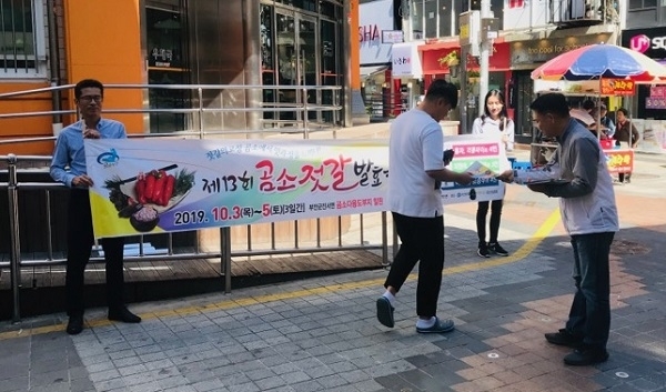 부안 진서면 곰소다용도부지에서 오는 10월 3일부터 5일까지 젓갈발효 축제한마당이 열린다. 이에 따라 진서면사무소 직원 5명은 24일 광주광역시, 목포시에서 곰소젓갈발효축제 홍보물 배부와 안내 등 적극적인 홍보에 나섰다.이날 진행된 홍보활동은 곰소젓갈발효축제를 전국적으로 알리는 동시에 축제의 성공개최를 기원하는 의미로 마련됐으며, 곰소 젓갈의 우수성과 다양하고 재밌는 축제 콘텐츠를 적극 알리는데 중점을 두었다.