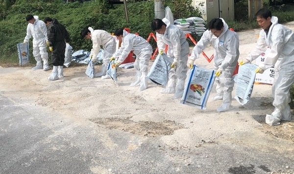 또 공동방제단 차량을 동원해 축사 주변에 소독약을 뿌리고 농가 차량 진출입로에 생석회 가루를 살포하는 등 방역에 총력을 다하고 있다.