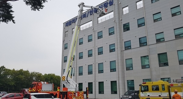 이번 훈련엔 요양병원상 피난약자가 많은 특수한 상황을 고려해 △이동식 침상 전체 이동 대피훈련 △경사 하강식 구조대 사용 △소화기 및 옥내소화전을 통한 초기 화재진압 등을 중심으로 진행됐다.