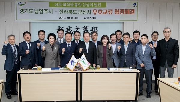 군산시와 남양주시는 8일 남양주시청에서 강임준 군산시장과 조광한 남양주시장을 비롯한 양 시의 국장, 부서장 등 20여명이 참석한 가운데 우호교류 협정을 체결했다.