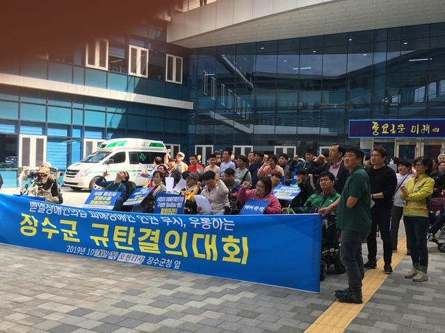 장수 벧엘의 집 대책위(이하 대책위)가 10일 오전 11시 장수군청 광장에서 장수군 규탄 결의대회를 가졌다.