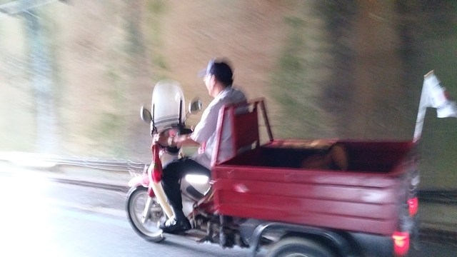 오토바이를 개조한 짐차(?)를 타고 한 노인이 나그네를 스쳐 갑니다. 자전거를 탄 젊은이가 씽씽 지나가고 있습니다. 노소가 함께 하는 오늘의 향가터널은 과거를 안고 미래를 담고 있습니다. 이제는 시원한 터널입니다. 그들을 따라 밖으로 나왔습니다,