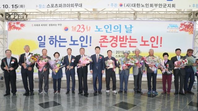 부안군은‘제23회 노인의 날’기념 한마당 잔치를 15일 부안스포츠파크 보조경기장에서 경로효친사상을 널리 고취하고자 개최했다.이날 행사는 대한노인회 부안군지회(지회장 김종열) 주관으로 권익현 군수와 이한수 군의회 의장을 비롯한 관내 기관사회단체장, 관내 어르신 등 3000여명이 참석한 가운데 흥겨운 잔치마당으로 치러졌다.부안 출신 전문 MC이자 가수인 김종석씨 사회로 시작된 식전공연은 대한노인회 부안군지회의 체조교실 수강생들로 이뤄진 생활체조 공연과 메리엘스 난타공연으로 행사의 시작을 알렸다. 이어 노인강령 낭독과 감사패, 모범노인 표창패, 효행자 표창장 등을 수여했으며 올해 100세가 되신 장수어르신 두 분에게 대통령의 청려장(장수지팡이) 전달과 장수패를 증정했다.특히 올해 기념행사는 실외로 장소를 옮겨 어르신들이 다함께 친목과 화합을 다지는 명랑운동회, 장기자랑 등의 시간을 가져 어느 해보다 알찬 행사로 꾸며졌다.