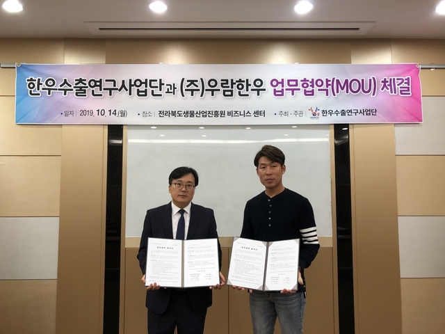 농림축산식품부와 농림식품기술기획평가원이 주관하는‘한우수출연구사업단(단장 이승제)과 ㈜우람한우(대표이사 전명기)는 지난 14일 (재)전라북도생물산업진흥원에서 ‘한우고기 홍콩 수출활성화를 위한 업무협약’을 체결했다.