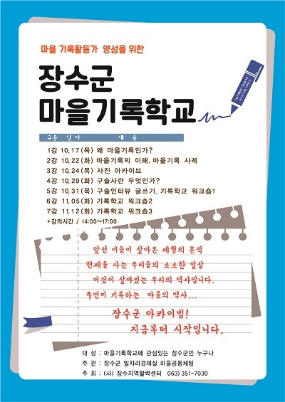 장수군이 민간기록의 보존과 활용을 통해 지역 정체성을 찾고 발전시키기 위해 장수군 마을 기록 학교를 개설하고 17일부터 오는 11월 12일까지 운영한다.