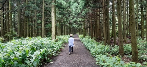 표지판 안내대로 오른쪽을 택했다. 숲길 입구에서 가장 먼저 탐방객을 반기는 것이 울창한 삼나무 숲이다. 햇살 한 자락 들어올 틈 없을 정도로 빽빽한 탓에 다소 주눅이 들 듯도 하지만 숲이 품어내는 향기와 좋은 기운에 기분을 한껏 끌어 올린다