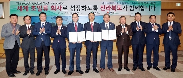 전라북도와 정읍시, KCFT(주)는 22일 정읍 3산업단지에 전기차와 스마트폰 노트북등의 리튬 전지용 동박 생산시설을 증설하는 1213억원의 대규모 투자협약을 체결했다.