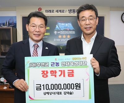 주)삼해상사(대표 김덕술)는 지난 21일 부안군 근농인재육성재단을 방문해 지역인재 육성을 위해 써 달라며 장학금 1000만원을 기탁했다.삼해상사는 부안지역 김 가공업체로서 지난 2005년부터 현재까지 꾸준히 장학금으로 총 3600만원을 기탁해오고 있다.김덕술 대표는 “지역주민과 더불어 함께하는 기업으로 육성시키고자 하는 마음에서 회사이익의 일부를 지역사회에 환원차원에서 장학금을 기탁하게 됐다”며 “학생들이 맘껏 꿈과 이상을 갖고 자신의 역량을 충분히 발휘할 수 있는 교육환경 개선에 미력하나마 정성을 보태게 돼 기쁘다”고 기탁배경을 설명했다.