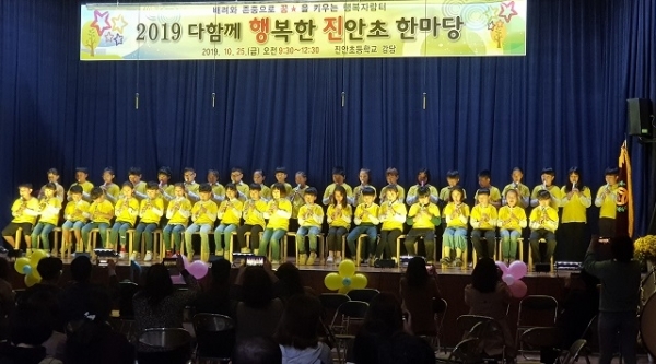 진안초등학교(교장 최선용)가 지난 25일 ‘2019 다함께 행복한 진안초 한마당(이하 행진한마당)’ 행사를 열었다. 학부모와 교직원 등 200명가량이 참석한 가운데 학교 강당에서 열린 이날 행사에는 총동창회 윤석정(전북일보 사장) 회장과 김두흠 사무국장 등 다수 동문과 관내 사회단체장 등 유명인사들이 대거 자리를 함께했다.