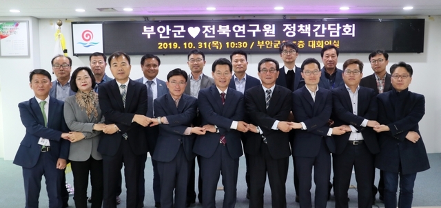 부안군은 지난달 31일 부안군청 5층 대회의실에서 전북연구원(원장 김선기)을 초청해‘매력적인 부안, 지속가능한 부안’을 주제로 정책간담회를 가졌다.이 간담회는 부안군이 발굴한 국가예산 확보 신규 사업에 대한 전북연구원의 검토의견을 청취하고 군정현안인 수소연료전지 플랫폼 구축과 부안형 푸드플랜 구축, 고려삼강청자 세계화 등에 대한 설명에 이어 도출된 쟁점사항에 대해 토론하는 순으로 진행됐다. 특히 이날 정책간담회는 권익현 군수를 비롯한 주요 간부공무원 뿐만 아니라 신규시책을 발굴한 일선 공무원들도 함께 참여해 자신이 발굴한 국가예산 사업들에 대한 보완사항을 현장에서 질의·응답하는 등 생산적인 논의를 이어갔다.