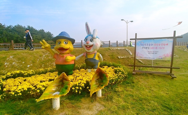 청암산 주차장에 주차 후 가벼운 복장으로 군산 호수로 걸어가면 청암산 마스코트 토끼와 거북이가 국화꽃밭에서 반갑게 맞이해줍니다.