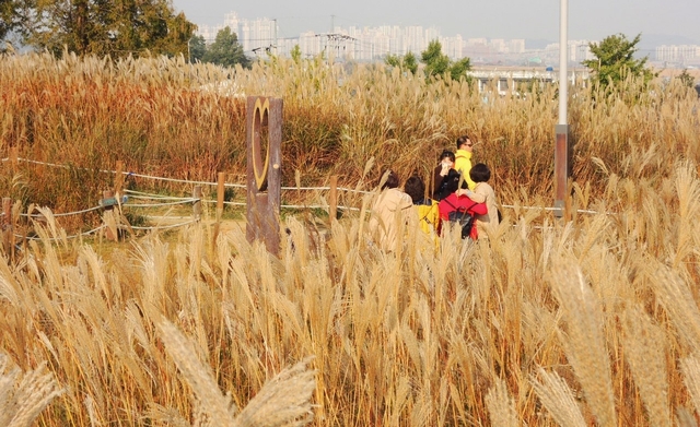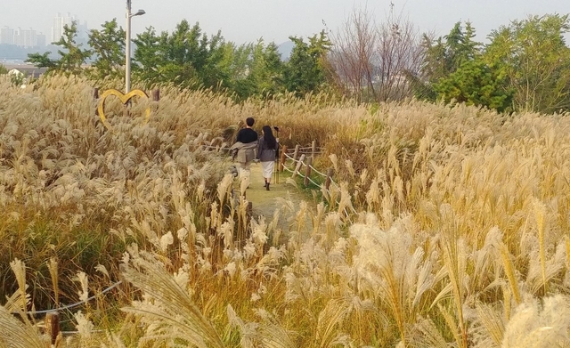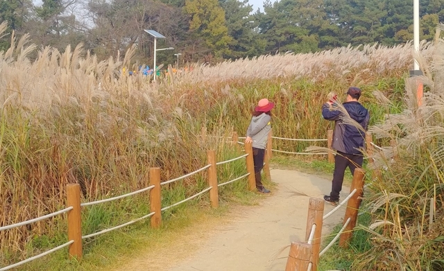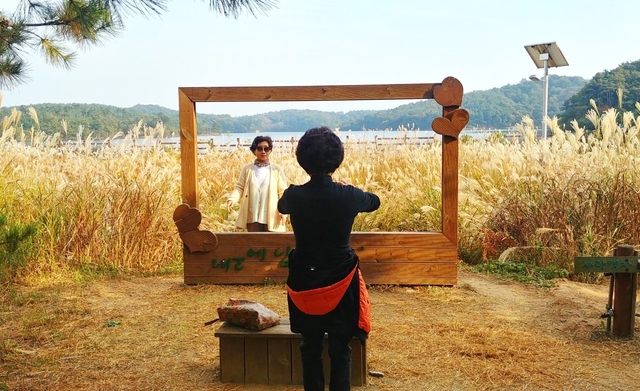 군산 호수의 시원한 풍경과 어우러진 억새밭 곳곳에는 발길을 붙잡는 포토존을 만들어