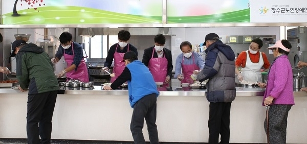 장수군 건설교통과 소속 직원들로 이뤄진 배식봉사단은 이달부터 매주 수요일 장수군 노인 장애인 복지관 식당에서 주민들의 행복한 한 끼 식사를 돕고 있다.