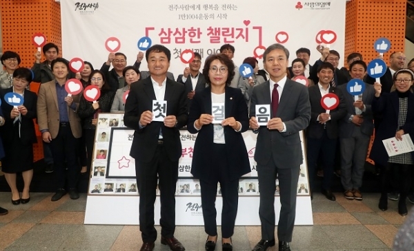 전주시복지재단 ‘전주사람’(이사장 유창희)은 11일 전주시청 로비에서 이웃에게 행복을 전하는 특별한 기부릴레이인 ‘삼삼한 챌린지’의 시작을 알리는 기념행사를 가졌다. ‘삼삼한 챌린지’는 전주시복지재단 ‘전주사람’이 기획한 소액기부캠페인으로 매월 1만1004원을 기부하기로 약정한 ‘기부천사’가 SNS를 활용해 3일 안에 3명의 기부천사를 추천하는 릴레이 후원운동이다.