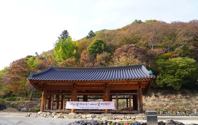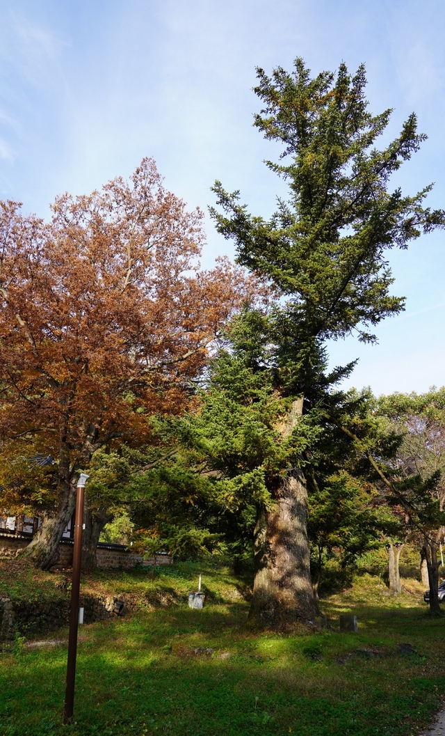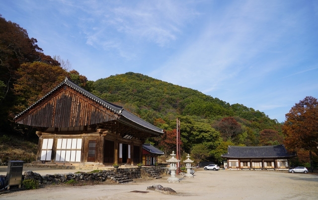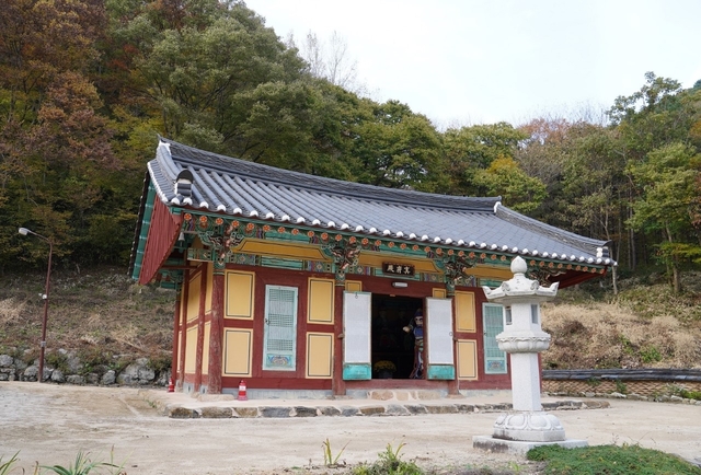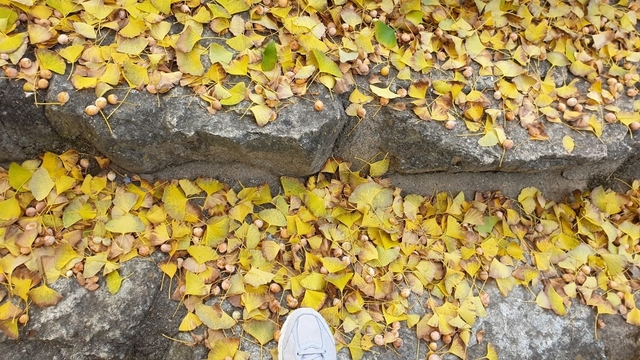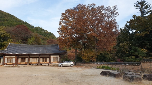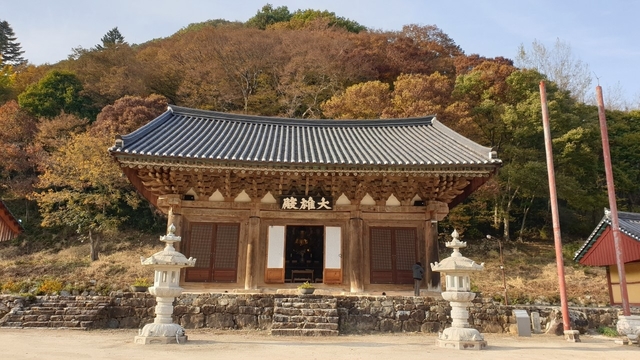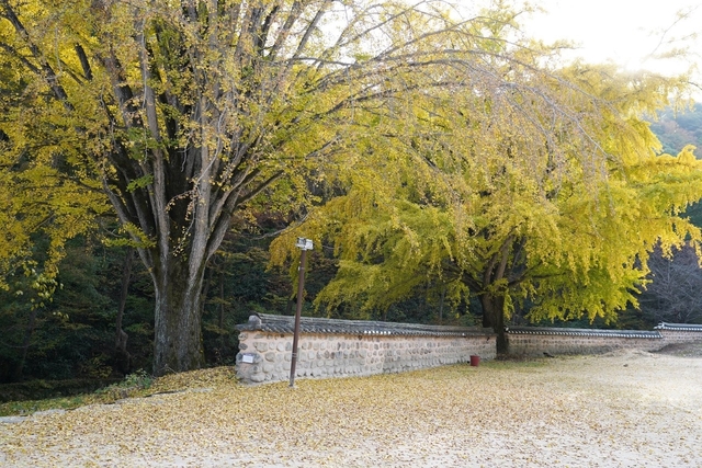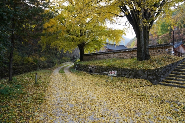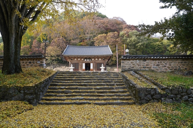 사찰로 들어가기도 전에 노란 은행 열매와 은행잎이 가을로 마중 나와 있습니다. 올라가는 돌계단에도 가을이 뒹굴고 있습니다. 정면에 보이는 대웅전으로 가는 발걸음 하나마다 가을이 느껴집니다. 담장 옆의 커다란 은행나무 두 그루가 사찰을 찾은 방문객에게 계절의 선물을 만끽하게 해줍니다.