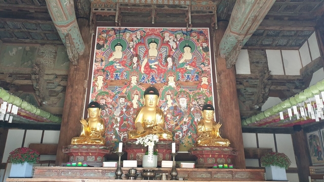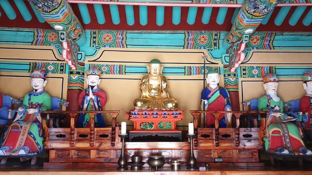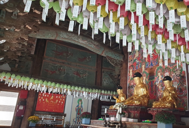 대웅전 내부에는 석가모니 삼존불이 봉안되어 있습니다. 불상 위에 닫집을 달고 우물천장으로 마감을 했습니다. 나한상과 동자상이 벽화로 조성된 개성 있는 건축물입니다. 단청의 빛이 바래 자연목 그대로의 색조가 더없이 정답게 느껴집니다. 공포나 가구 장식이 조선 후기의 건물로 짐작게 합니다.